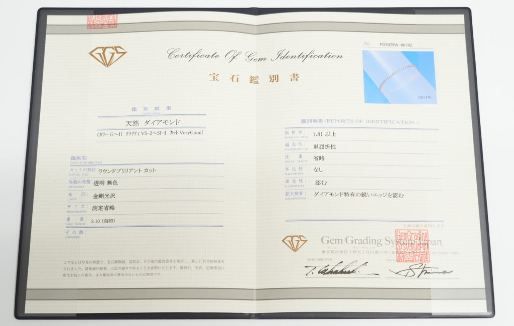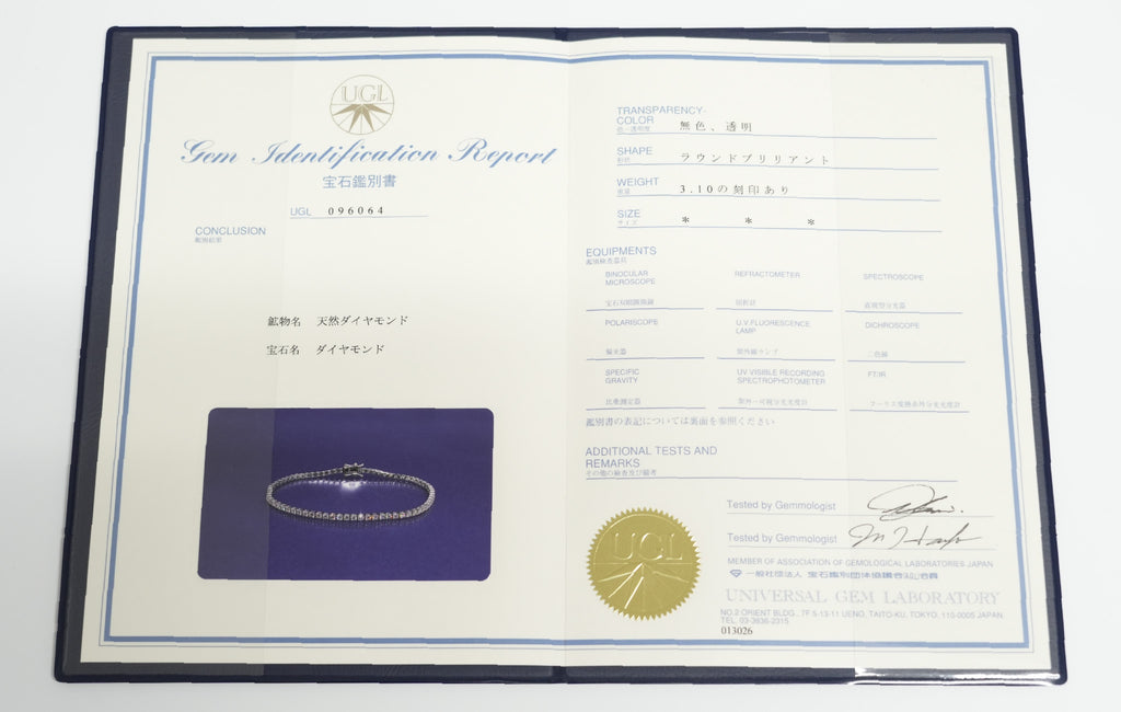 商品名 ダイヤモンドテニス ブレスレット ストレート Pt900枠/Pt850(金具部分一部) 幅約2.7mm 20cm トータル3.10ct カラー:G〜H クラリティ:VS-2〜SI-1 カット:VG ※ダイヤモンドのグレードは目安となります※