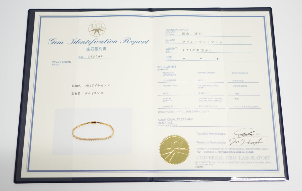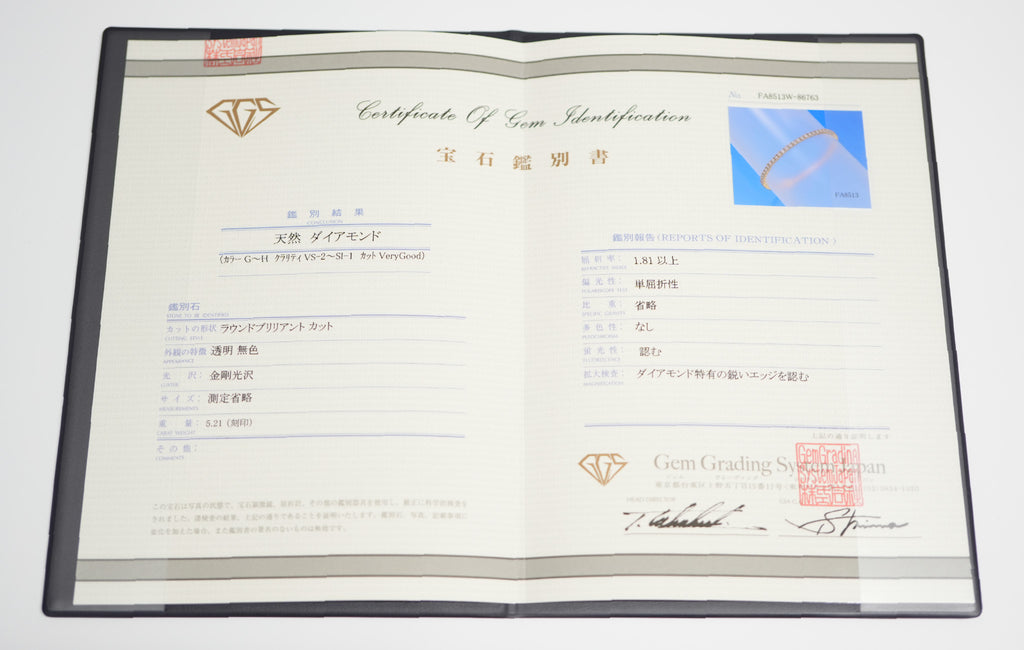 商品名 ダイヤモンドテニスブレスレット ストレート K18枠 幅3.4mm 20cm トータル5.21ct カラー:G〜H クラリティ:VS-2〜SI-1 カット:VG ※ダイヤモンドのグレードは目安となります※